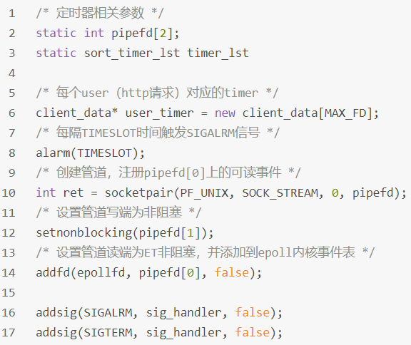 - 执行自定义的信号函数 addsig:其中定义了信号捕获函数(当捕获到 SIGALRM 和 SIGTERM 信号则执行信号处理函数:传递给主循环的信号值